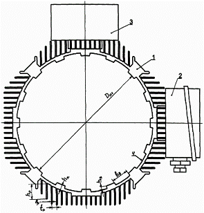 и 495 мм имеет прорези-выемки 4 в количестве nв=8...12 с размерами bв×hв (мм) для повышения эффективности охлаждения машины.