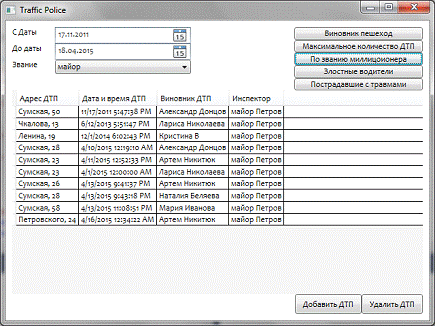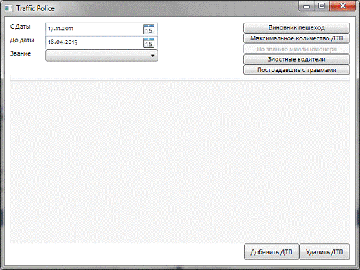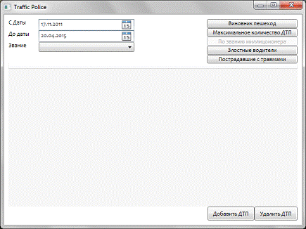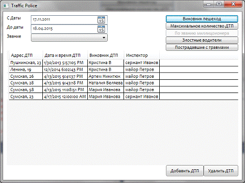 показывает полный список ДТП, на которые выезжали милиционеры с указанным званием