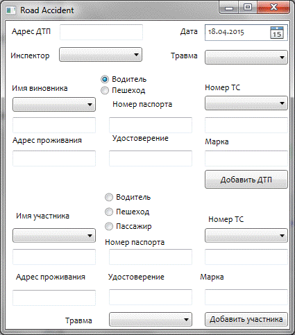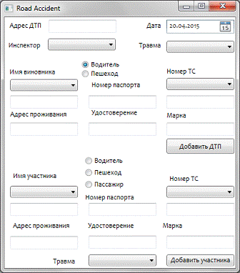 На окне добавления ДТП расположены: