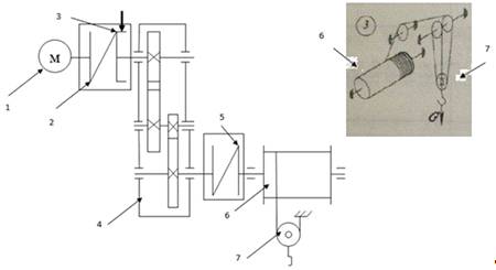 Редуктор; 5. Муфта; 6. Барабан; 7. Полиспаст.