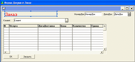 Рисунок 7 - Форма с компонентами документа "Заказ"