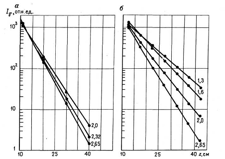 сопоставления I/I0 и I2/I0 следует, что зависимость Ln(I/I0) = f(ρ) близка к линейной при z > 20 см.
