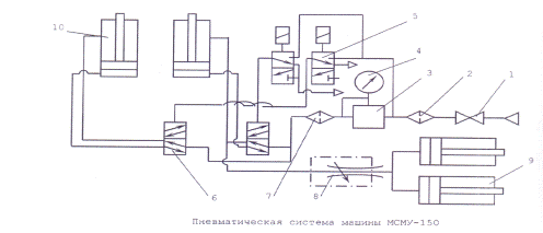 исходное положение после сварки. Пневматическая система состоит из вентиля 1,