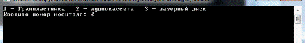 аудиокассета 3 - лазерный диск";<<"\nВведите номер носителя: