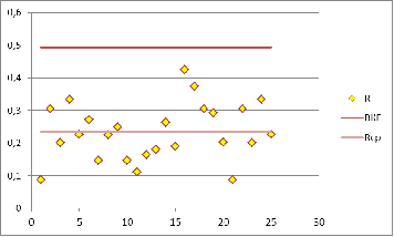 контрольные карты размахов (рисунок 3) показали, что данный процесс стабилен и