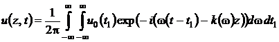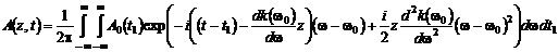t - z/vгр, k" = d2k(w0)/dw2 = d(1/vгр)/dw - дисперсия групповой скорости.