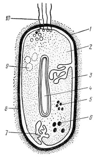 капсула; 9 - гранулы полисахарида; 10 - жгутики.