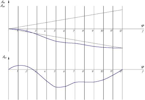 положения механизма 0, 1, 2, …, 12, а по оси ординат - значения разности