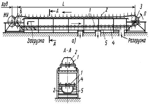 последовательный набор движущихся открытых ящиков без дна; дном служит