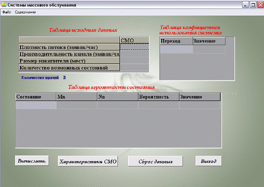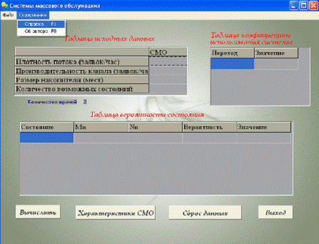 ='Ïëîòíîñòü ïîòîêà (çàÿâîê/÷àñ) ';. Cells [0,2]: ='Ïðîèçâîäèòåëüíîñòü êàíàëà (çàÿâîê/÷àñ) ';. Cells [0,3]: ='Ðàçìåð íàêîïèòåëÿ (ìåñò) ';. Cells [0,4]: ='Êîëè÷åñòâî âîçìîæíûõ ñîñòîÿíèé ';. Cells [1,4]: =' ';. Cells