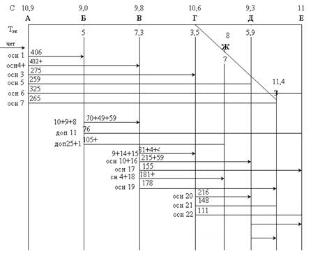 строится исходный поструйный ступенчатый график вагонопотоков чётного направления