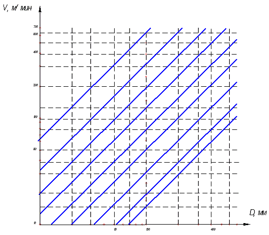 откладывается скорость резания lg V, по оси абсцисс - диаметр детали lg D.