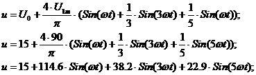 временные графики гармоник напряжения, суммарную кривую и заданное напряжение.