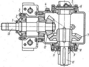 шестерни конического редуктора отворачивают болты крепления крышек 5 и 11
