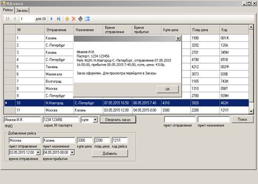 MessageBox.Show(fio + "\nПаспорт: " + pasp + "\nРейс " + kodr + ": " + reys + ", отправление " + data_o + ", прибытие " + data_p + ", " +