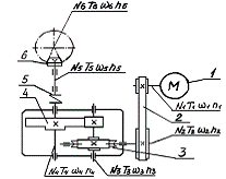 3-червячная передача; 4-прямозубая цилиндрическая передача; 5-муфта;