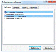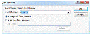 В диалоговом окне Добавление выбирается таблица, в которую будут