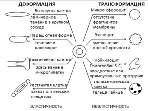 формы эритроцитов при его деформации, возникающей при различных напряжениях