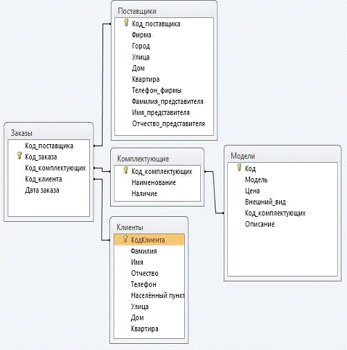 операторов SQL будет выглядеть следующим образом: CREATE TABLE Модели ([Код] integer,[Модель] text,[Цена] money,[Описание] image,[Внешний_вид] image,[Код_комплектующих] integer,CONSTRAINT [Индекс1] PRIMARY KEY([Код]));