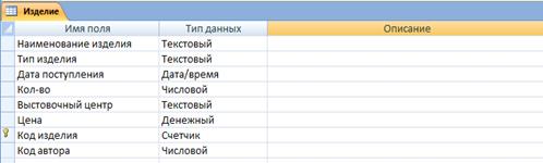 Ключевым полем в данной таблице является «Код изделия», рисунок 2.2.