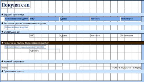покупателей вычисляется по формуле Count(*). Форма отчёта по покупателям в режиме конструктора представлена на рисунке