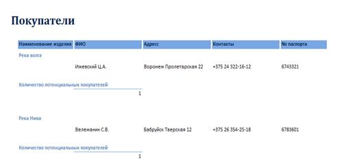 отчёт на основе данных из таблиц Покупатели и Изделие. В отчёте присутствуют