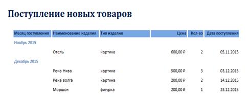 основе запроса Поступление новых товаров. В отчёте присутствуют следующие поля: