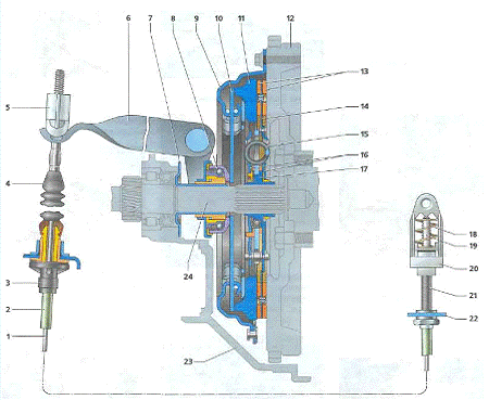 привода сцепления; 2 - оболочка троса; 3 - нижний наконечник оболочки троса; 4