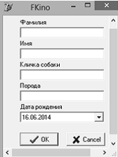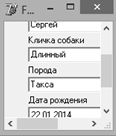"окошками" "Кличка" собаки и "Порода" собаки.