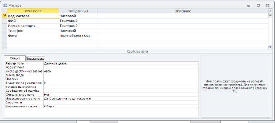 конструктора таблиц. Для каждой таблицы, указываем имя, имена полей и тип