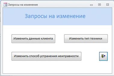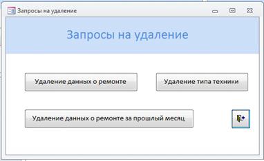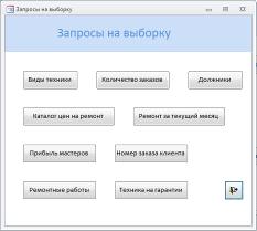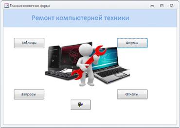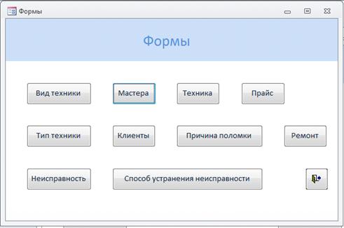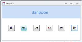 «Запросы», «Отчёты», «Формы», «Выход». Каждая кнопочная форма содержит кнопку