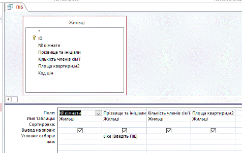 квартири,м2]Жильці(((Жильці.[Прізвище та ініціали]) Like [Введіть ПІБ]));код