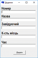 ("INSERT INTO Зайнятість (Номер, Назва, Завідуючий, К_сть_місць,