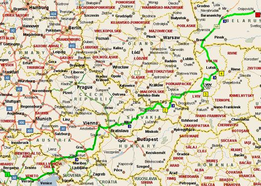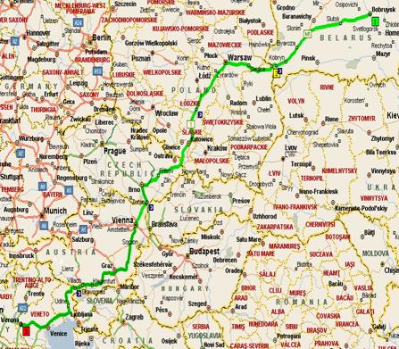 Рисунок 1.1 - Маршрут перевозки Бобруйск - Верона (через Чехию)