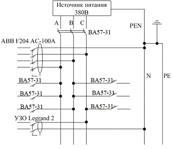 на вводе ВА57-31 с номинальным током выключателя 100А, с выключателями