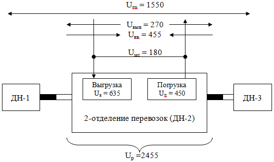 Работа отделения перевозок составила Uр = 2455 вагонов в сутки, из которых 1550 вагонов - это