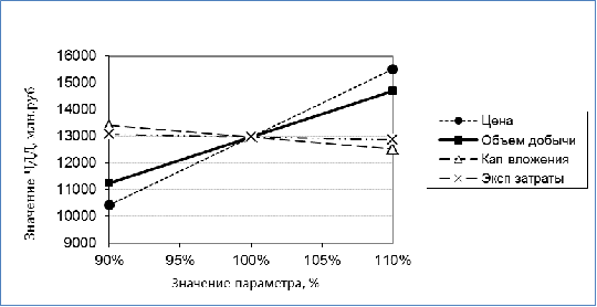 увеличивается на 2543,75млн. руб.; при увеличении объёма добычи на 10% - ЧДД увеличивается на 1724,91млн.