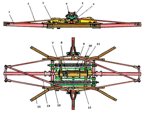 тяга; 13 - поворотный вал; 14 - диагональная распорка; 15 - основания.