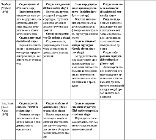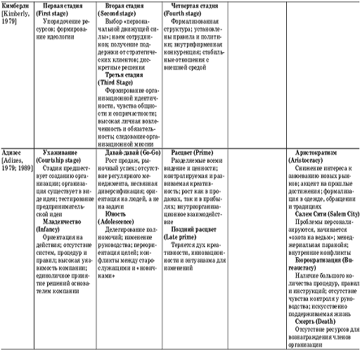 Стадии и краткие характеристики моделей жизненного цикла организации