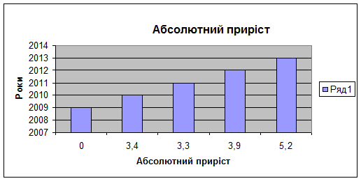 абсолютний приріст, темпи зростання та приросту за роками й до 2010 р;