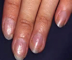 осмотр ногтевых пластинок. Выявлен положительный симптом «наперстка»: