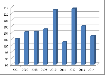 с предыдущим показателем 2013 года - 107,6%. Такое замедление положительной