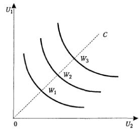 благосостояния эгалитарного общества: субъект 1 и субъект 2 имеют строго равную