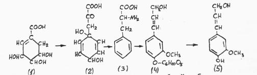 кислота; 2 - префеновая кислота; 3 - фенилаланин; 4 - кониферин; 5 -