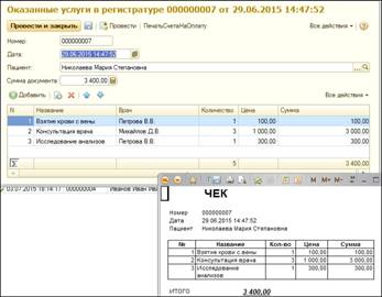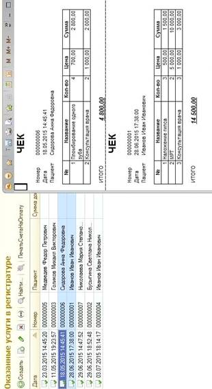 указанием услуги, Ф.И.О. пациента, количества, цены и общей суммы. Аналогичный
