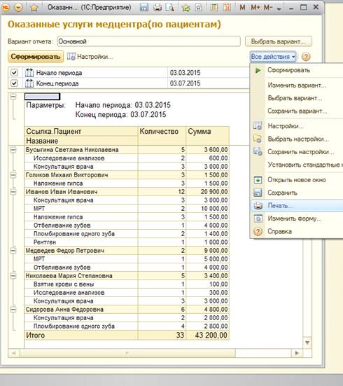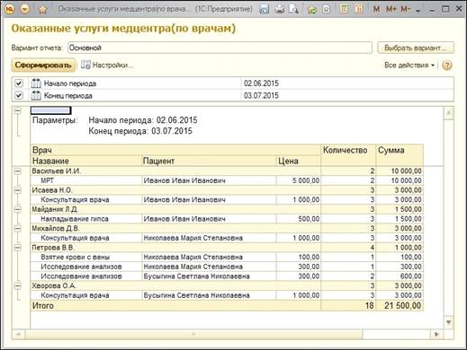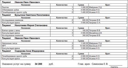 услуг в разрезе врачей (рис.10). Группировка происходит по фамилии врача, с