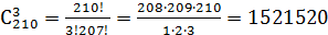 из 210 групп, во второй день можем выбрать любую из 209 групп, в третий день