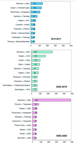 международных мигрантов по десяти крупнейшим коридорам миграции между странами