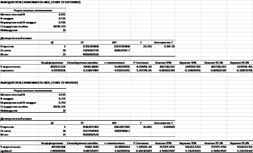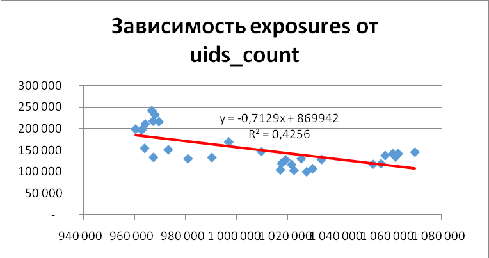 Значение квадрата корреляции 0,43 показывает нам, что 43% изменчивости exposures объясняются изменчивостью uids_count.