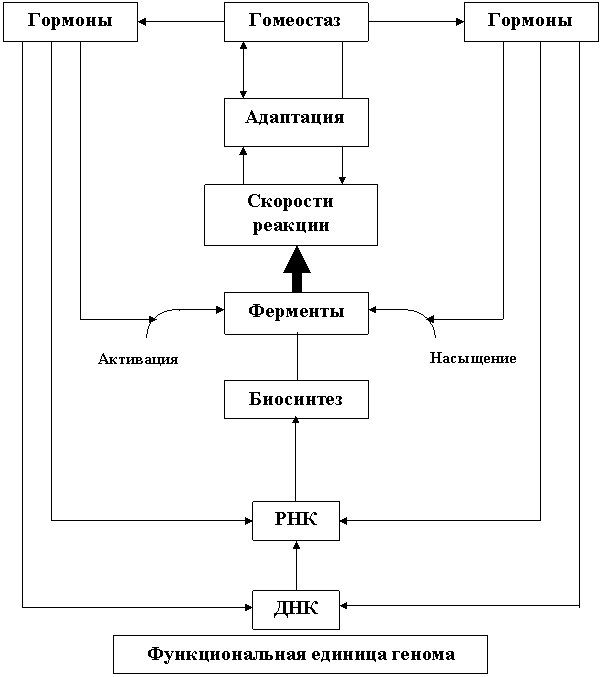 Взаимодействие генов, ферментов и гормонов в общем процессе регуляции, создающем гомеостаз.